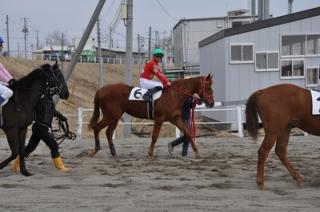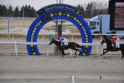 写真中:今年デビューの水野 翔騎手(4Rゴール前)