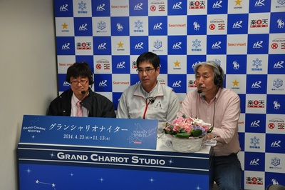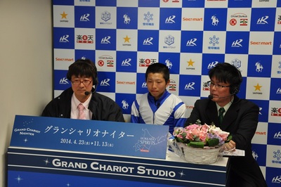 本日のグランシャリオスタジオ(4月23日) 2014.04.23 第8競走のパドックゲストとして、水野 翔騎手が出演してくれました。初騎乗を終えての感想と今後の騎乗に対する抱負を話しました。 続く、第9競走のパドック解説ゲストとして、社台ファーム調教主任の東 礼治郎氏が出演し、今年初の2歳戦JRA認定競走スーパーフレッシュチャレンジ競走Ⅰ(1200m)の出走馬の解説をして頂きました。 写真上:水野 翔騎手 写真下:東 礼治郎氏