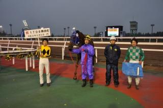 宮崎 光行騎手1,700勝達成 2014.06.12 6月12日(木)、門別競馬 第8レースで宮崎 光行騎手(松本 隆宏厩舎)がビーミーショー号に騎乗し、昭和59年のデビューから、11,542戦目で中央・地方通算1,700勝を達成しました(ホッカイドウ競馬では現役2人目 )。 宮崎 光行騎手コメント 「こんなに勝利することが出来たのも、自分の経験の積み重ねと関係者の皆様のおかげです。」 写真:口取り
