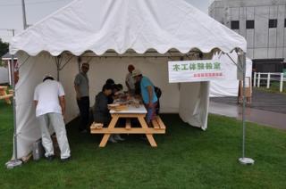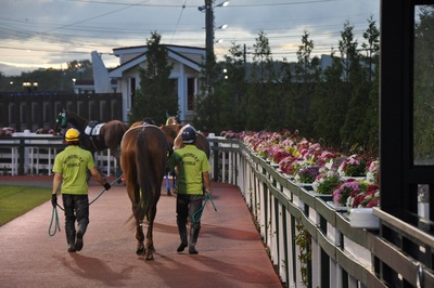 シュエット・ジュマン・フェスティバル初日の門別競馬場は、ブリーダーズゴールドカップ競走のシンボルフラワーである「ダリア」で装飾され、時より雨が降る天気となりましたが、ウニモグ体験乗車(馬場整備車両)、スターター体験(発走模擬体験)、木工体験教室などのイベントが行われました。
