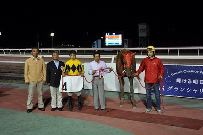 千葉 津代士調教師100勝達成 2014.09.10 9月10日(水)、門別競馬 第11競走でコラソンロコ号が1着となり、管理する千葉 津代士調教師は、1,071出走で通算100勝を達成しました。 千葉 津代士調教師コメント 「日頃から支えてくれるきゅう舎スタッフや、関係者の皆さんのおかげで100勝達成することができました。今後とも応援よろしくお願いします。」 写真:口取り