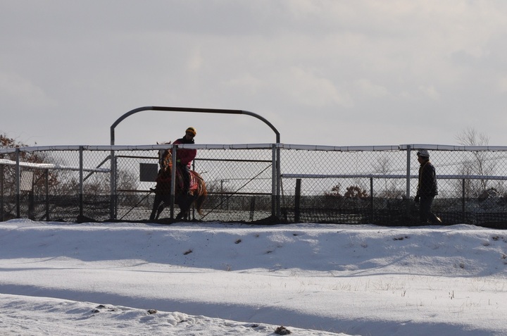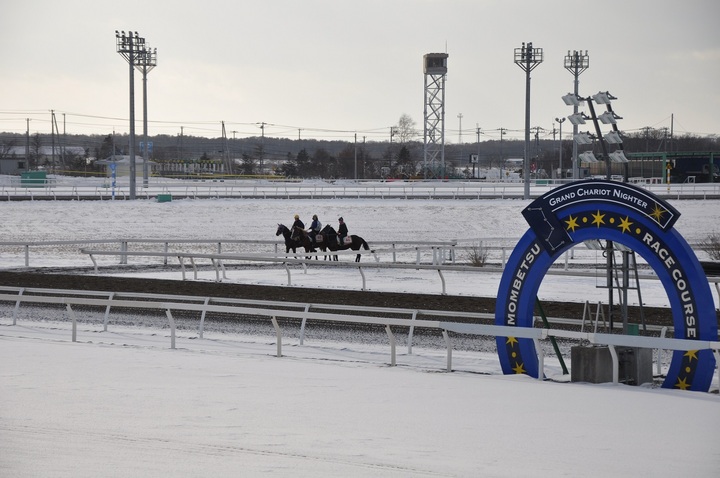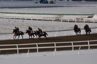 雪の積もる厳しい寒さの中、門別競馬場では開幕に向けて調教が行われています。