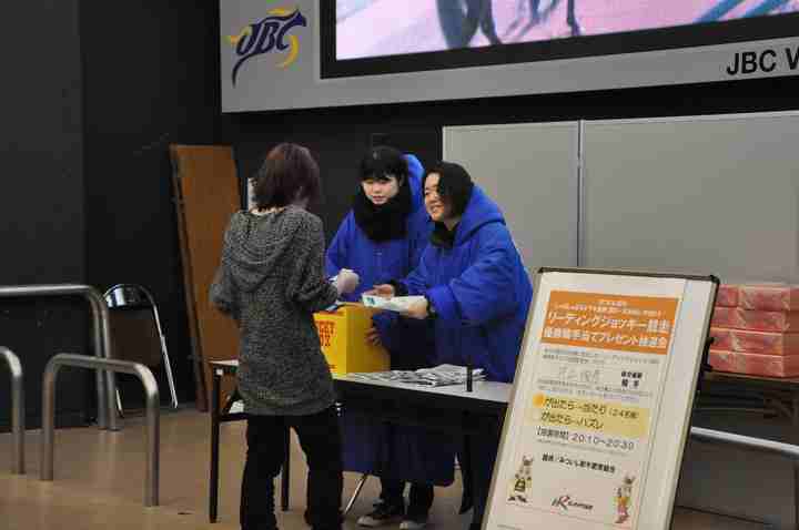 また、門別競馬場では「リーディングジョッキー競走」開催記念抽選会が行われ、総合優勝した井上 俊彦騎手の整理券をお持ちのお客様に抽選で、みついし和牛「しゃぶしゃぶスキヤキ兼用 肩ロース300g」がプレゼントされました。