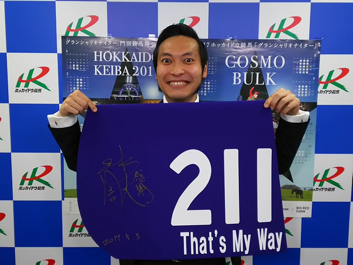 5月3日(祝水)ホッカイドウ競馬オフィシャルサポーター上杉周大さんの来場イベントおよび協賛競走「That’s My Way賞」開催を記念して、『上杉周大さんサイン入りのオリジナルゼッケン』を抽選で3名様にプレゼントします。ご希望の方は住所・氏名・年齢・職業・電話番号を記入のうえ、Eメールまたはハガキでご応募ください。応募期間と応募先は以下のとおりです。皆様のご応募お待ちしております。