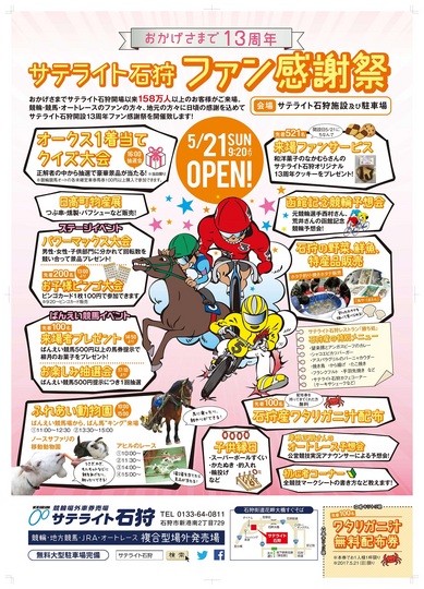 Aiba石狩(サテライト石狩)では、5月21日(日)、サテライト石狩開設13周年ファン感謝祭として、オークス1着当てクイズ大会や岸根正朋アナウンサーのオートレース予想会など、イベントが多数実施されます。(詳細は下記のリンクからご覧ください。)お近くの方はぜひ足をお運びください。