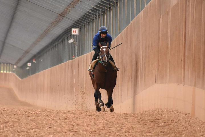 「まだ余裕のある体つきなんですが、現状、これで動けているので、あえて絞ることはしません。力を十分に出せるデキです。血統・馬体からはダート向きの色合いが濃いので、芝のスピード競馬に対応できるかどうか心配です。とはいえ、これまでの実戦では、アドリブがきくというか、対応力の高さを見せているので、そこにいちるの望みをかけています。」