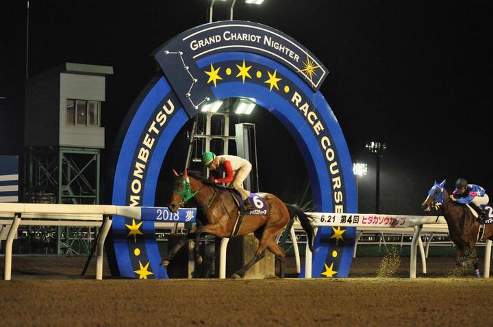 本日のメイン競走、AIRDO賞 第4回 ヒダカソウカップ〔H2〕(マジェスティックウォリアー賞)[ダート1,600m(内) 曇・不良 ]が行われ、4番人気ディナスティーア号が2着アップトゥユー号に3馬身差をつけて優勝しました。(タイム:1.43.4)