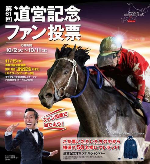 第61回道営記念(11月15日施行)の出走馬ファン投票を10月2日(火)より実施いたします。投票に参加された方の中から、抽選で50名様に「道営記念オリジナルジャンパー」をプレゼントいたしますので、たくさんのご応募をお待ちしております。