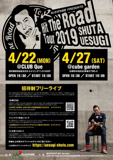 4月22日(月)東京会場(CLUB Que)・4月27日(土)札幌会場(cube garden)の2会場をまわる平成最後を締めくくるスペシャルライブで、事前応募・抽選による招待制のフリーライブ(観覧無料)となります。ぜひ、この機会に、ライブ会場で上杉周大さんの熱いパフォーマンスをお楽しみください。