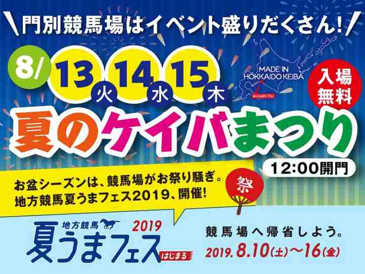 そのほか、夏休み・お盆休み期間の全国の地方競馬開催場を盛り上げるイベント「地方競馬 夏うまフェス2019」や、札幌発着無料送迎バス「夏の特別便」の運行といった、同時期の開催トピックスについてもご案内します。皆様のご来場をお待ちしております。