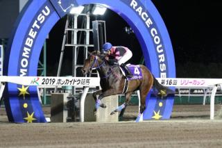 本日のメイン競走、HTB杯 第16回 リリーカップ〔H3〕(ラブリーデイ賞)[ ダート1,200m(外) 曇・重 ]が行われ、4番人気プリモジョーカー号が2着グローリアスレゴン号に3馬身差をつけて優勝しました。(タイム:1.12.5)