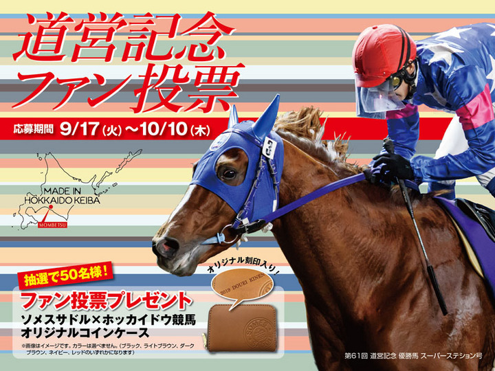 第62回道営記念(11月7日実施)の出走馬ファン投票を9月17日(火)より実施いたします。投票に参加された方の中から、抽選で50名様に「ソメスサドル×ホッカイドウ競馬 オリジナルコインケース」をプレゼントいたしますので、たくさんのご応募をお待ちしております。