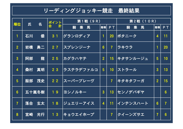 なお、リーディングジョッキー競走の結果については以下のとおりとなりました。