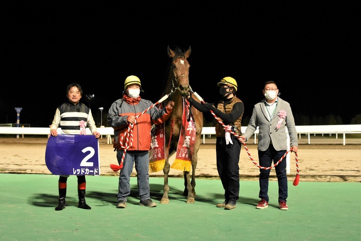 本日のメイン競走、道新スポーツ杯 第44回 北斗盃〔H2〕(ヴィクトワールピサ賞)[ ダート1,600m(内) 晴・良 ]が行われ、2番人気レッドカードが2着アッカレッツァーレにクビ差をつけて優勝しました。(タイム:1.45.1)
