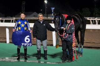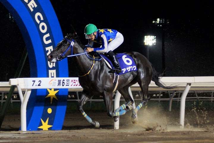本日のメイン競走、スーパースプリントシリーズ2020 雪印メグミルク杯 第6回 グランシャリオ門別スプリント〔H2〕(ミッキーアイル賞)[ ダート1,000m(外) 雨・不良 ]が行われ、2番人気アザワクが2着メイショウアイアンに2馬身差をつけて優勝しました。(タイム:58.4レコード)