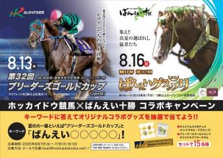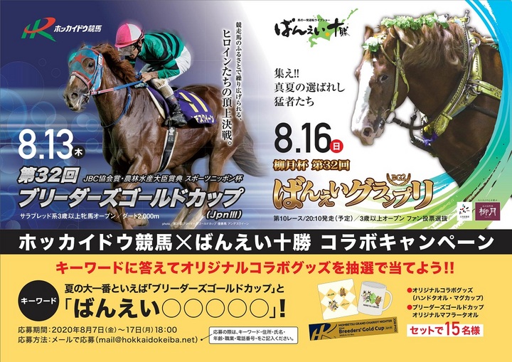 8月13日(木)にはホッカイドウ競馬・真夏のダート女王決定戦「ブリーダーズゴールドカップ(JpnⅢ)」、8月16日(日)ばんえい十勝では、ファン投票選抜の重賞競走「ばんえいグランプリ(BG2)」が開催されるなど、ますます馬文化を盛り上げる両団体がコラボし、「ホッカイドウ競馬・ホクトくん&ナナセちゃん」・「ばんえい十勝・リッキー」がデザインされたオリジナルコラボグッズと「ブリーダーズゴールドカップ開催記念オリジナルタオル」がセットで15名様に当たるプレゼントキャンペーンを実施いたします。