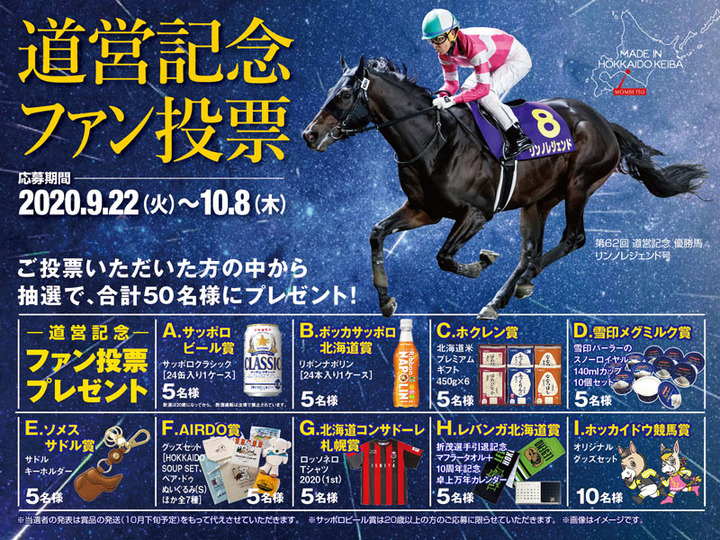 第63回道営記念(11月5日実施)の出走馬ファン投票を9月22日(火)より実施いたします。投票に参加された方の中から、抽選で合計50名様に「道産子企業の人気製品・グッズ」をプレゼントいたしますので、たくさんのご応募をお待ちしております。