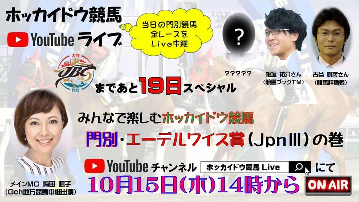 YouTubeにおいて、エーデルワイス賞(JpnⅢ)を実施予定の10月15日(木)14時から、「みんなで楽しむホッカイドウ競馬 門別・エーデルワイス賞(JpnⅢ)の巻」としてライブ配信を実施いたします。配信ページは下記のとおりです。当日はぜひご視聴ください。