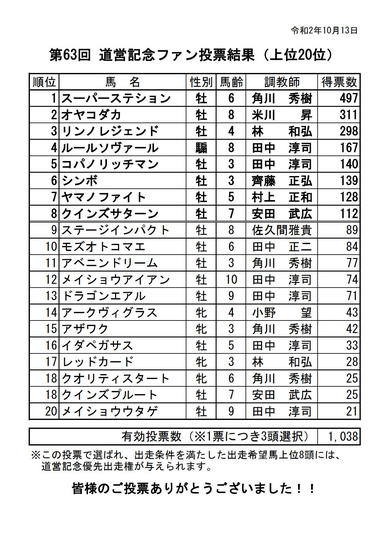 第63回道営記念ファン投票結果について