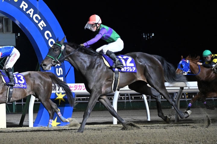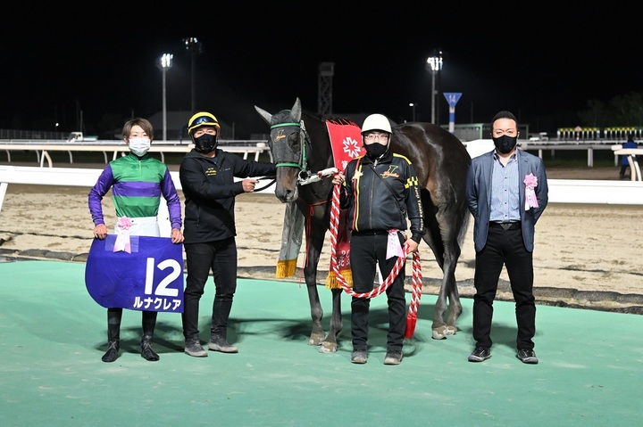 本日のメイン競走、AIRDO賞 第7回 ヒダカソウカップ〔H2〕(マジェスティックウォリアー賞)[ダート1,600m(内) 曇・良]が行われ、4番人気ルナクレアが2着クオリティスタートに1/2馬身差をつけて優勝しました(タイム:1.44.5)。