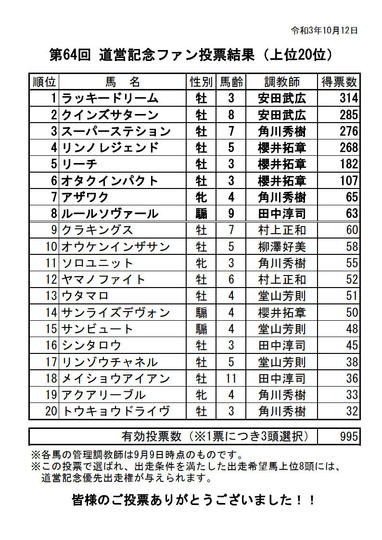 9月20日(月)から10月7日(木)までにご応募いただきました第64回道営記念(11月4日実施)の出走馬ファン投票の結果が、別紙のとおりとなりましたのでお知らせいたします。