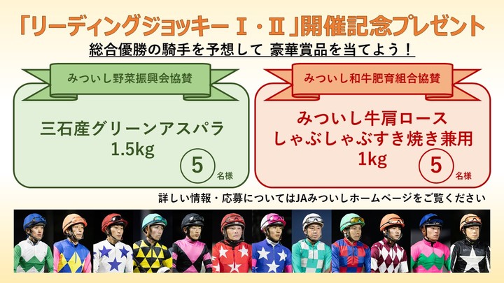 ご希望の方はJAみついしホームページの応募専用バナーより、リーディングジョッキーⅠ・Ⅱの総合優勝騎手を予想し、ぜひご応募ください。