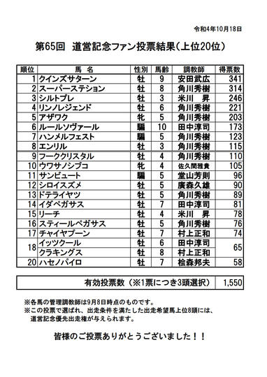 9月27日(火)から10月13日(木)までにご応募いただきました第65回道営記念(11月10日実施)の出走馬ファン投票の結果が、別紙のとおりとなりましたのでお知らせいたします。