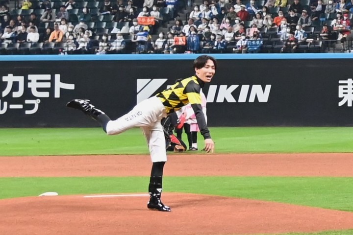 試合開始前のセレモニーとして、昨年度のホッカイドウ競馬リーディングジョッキーの落合玄太騎手とホッカイドウ競馬2023公式アンバサダー杉谷拳士がバッターとなり、始球式を行いました。