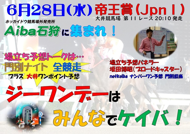 Aiba石狩イベントについて(6月28日) イベント 2023.06.26 Aiba石狩では、6月28日(水)にジーワンデーイベントを実施いたします。ブロードキャスター坂田博昭さんによる門別ナイト全競走プラス大井ワンポイント場立ち予想トークを行いますので、皆さまぜひお越しください。