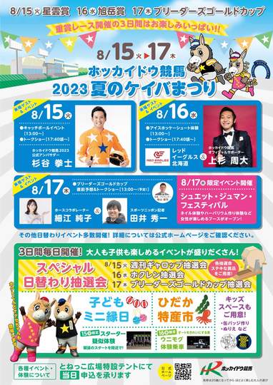 8月15日(火)・16日(水)・17日(木)の門別競馬場では、第35回ブリーダーズゴールドカップ(JpnⅢ)開催週のイベントとして、「夏のケイバまつり」を開催します。期間中は、各日スペシャルゲストが来場してのイベントやトークショーなどを予定しております。また、競馬場ならではのスターター疑似体験(15日のみ)、走路整備車両「ウニモグ」乗車体験(16日のみ)や日高管内のウマいものが勢揃いする「夏のひだかフェアin門別競馬場」、各日行われるスペシャル日替わり抽選会やミニ縁日など、競馬ファンから家族連れまで楽しめるイベント実施を予定しております。また、夏のケイバまつり最終日の8月17日(木)は『シュエット・ジュマン・フェスティバル(素敵な牝馬の祭り)』として、特色あるレディースイベントを実施いたします。ぜひ、ご家族・ご友人とお誘いあわせのうえ、門別競馬場にお越しください。