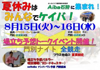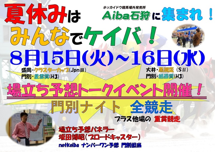 Aiba石狩イベントについて(8月15日~16日) イベント 2023.08.14 Aiba石狩では、8月15日(火)~8月16日(水)に夏休みはみんなでケイバ!イベントを実施いたします。ブロードキャスター坂田博昭さんによる門別ナイト全競走プラス地場の重賞競走の場立ち予想トークを行いますので、皆さまぜひお越しください。