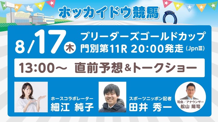 ホッカイドウ競馬公式YouTubeチャンネル「ホッカイドウ競馬情報局」では、門別競馬場で行われる BGC予想トークステージの様子を【公式】ホッカイドウ競馬情報局で中継します。