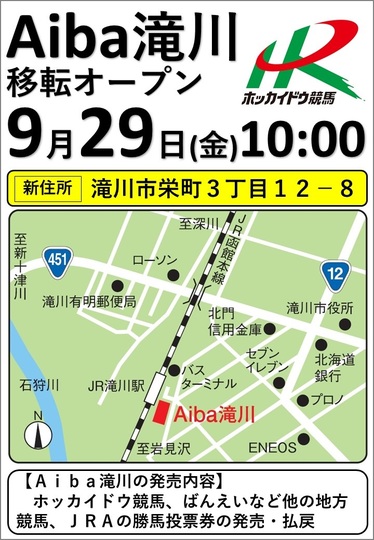 ホッカイドウ競馬の滝川場外発売所「Aiba滝川」は、移転オープンの準備のため営業を一時休止しておりますが、9月29日(金)に移転オープンいたしますので、お知らせいたします。皆様のご来場を心よりお待ちしております。