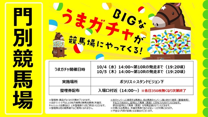 10月4日(水)と10月5日(木)門別競馬場において、以下のイベントを実施いたします。皆様のご来場お待ちしております。