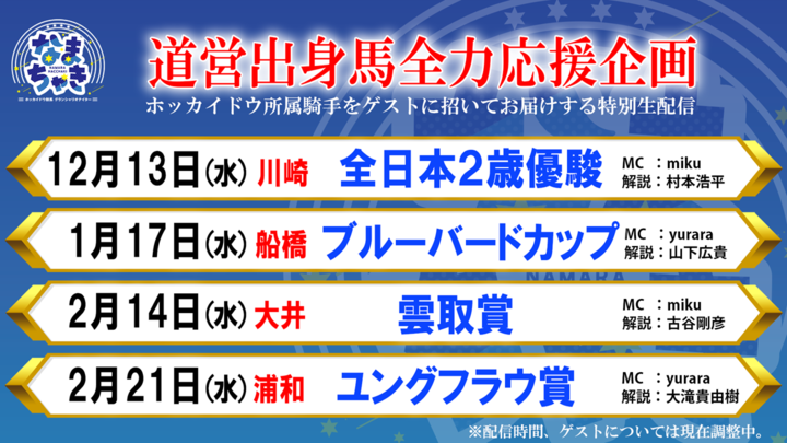 ホッカイドウ競馬は、オフシーズンを迎えましたが、ホッカイドウ競馬所属馬や出身馬達が各地で活躍しています。今回は、道営出身馬全力応援企画として、以下の日程で門別競馬場内のなまちゃきスタジオから生配信を実施します。各回の出演者は、以下のとおりです。そして、ゲストは、ホッカイドウ競馬の騎手が出演予定です。1回目となる12月13日のゲストは、明日発表させて頂きますので、お楽しみに!