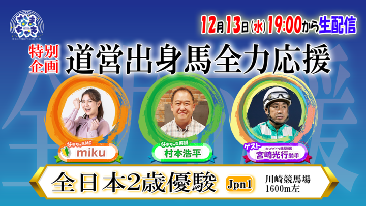 【公式】ホッカイドウ競馬LIVEなまちゃき特別企画として、「道営出身馬全力応援企画」を実施します。12月13日(水)の出演者・ゲストについては、以下のとおりとなっております。なお、今回のゲストは、2013年の全日本2歳優駿をハッピースプリント号で制覇した宮崎光行騎手が出演予定です。