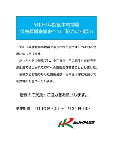さて、ホッカイドウ競馬では、被災された方々を支援するため、道内のホッカイドウ競馬場外発売所Aiba(J-PLACE)に募金箱を設置いたします。皆さまの温かいご支援のほど、よろしくお願いいたします。