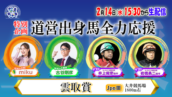 【公式】ホッカイドウ競馬LIVEなまちゃき特別企画として、「道営出身馬全力応援企画」を実施します。第3弾となる雲取賞の出演者・ゲストについては、以下のとおりとなっております。なお、今回のゲストは、井上俊彦騎手と岩橋勇二騎手が出演予定です。