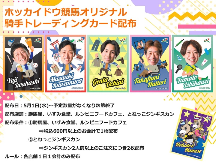 門別競馬場では、5月1日(水)より場内の飲食施設をご利用した方を対象に「ホッカイドウ競馬オリジナル騎手トレーディングカード」を配布します。