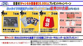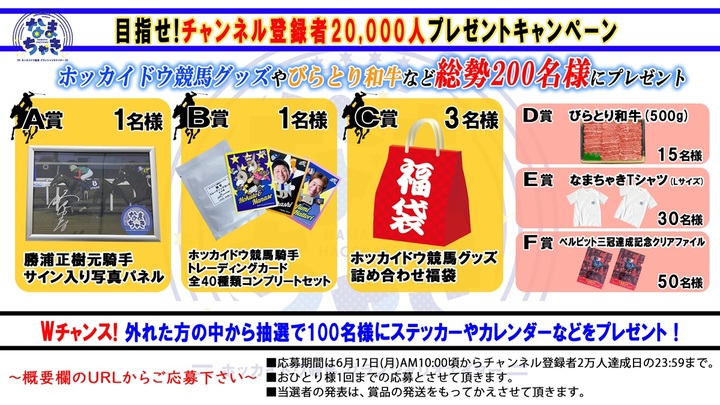 YouTubeホッカイドウ競馬LIVE「なまちゃき」のチャンネル登録者数2万人を目標としたプレゼントキャンペーンがスタートします。チャンネル登録者数が2万人を突破した際は、ご応募して頂いたなかから抽選で総勢200名様に以下の商品をプレゼントしますので、奮ってご応募!または「なまちゃき」へのチャンネル登録がまだの方は是非この機会にチャンネル登録をよろしくお願いいたします。