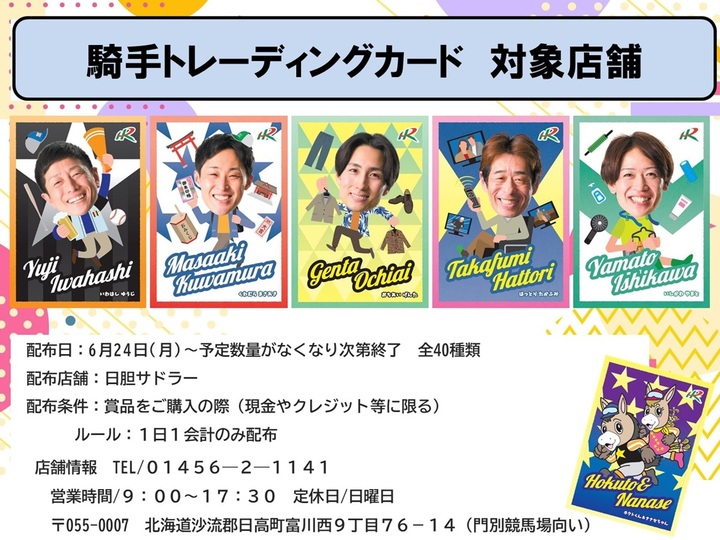 今回は、開催日にご来場出来ないお客様のために、門別競馬場のすぐそばにある日胆サドラー様にご協力して頂きまして、騎手トレーディングカードを配布することが決定しましたので、お知らせいたします。