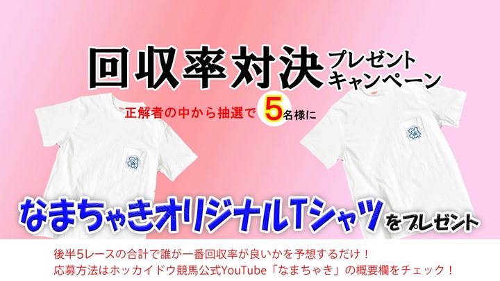 また、後半5レースの回収率対決を実施しております。視聴者の皆様には、誰が回収率で一番となるのか予想して頂き、的中者のなかから抽選で5名様に「なまちゃきTシャツ(Lサイズ)」をプレゼントしちゃいます。詳細については、それぞれの概要欄に応募URLが記載されておりますので、皆様のご投票をお待ちしております。