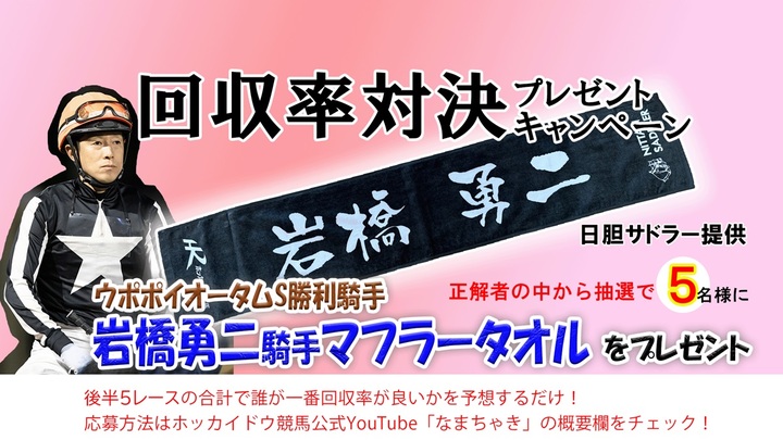 また、後半5レースの回収率対決を実施しております。視聴者の皆様には、誰が回収率で一番となるのか予想して頂き、今回は、的中者のなかから抽選で5名様に「岩橋勇二騎手のマフラータオル」をプレゼントしちゃいます。(提供:日胆サドラー)詳細については、概要欄に応募URLが記載されておりますので、皆様のご投票をお待ちしております。
