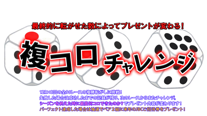 さらに、こちらも新企画として「複コロチャレンジ」もスタート!こちらは、以前の夢馬券企画の進化版として実施。視聴者の皆様とトヨDが一緒になって、最終日の期間中に複勝コロガシの最高記録数によってプレゼント賞品が決まる視聴者参加型企画となっております。