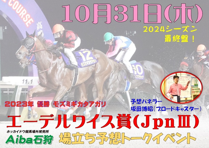 Aiba石狩イベントについて(10月31日) イベント 2024.10.21 Aiba石狩では、10月31日(木)にブロードキャスター坂田博昭さんによるエーデルワイス賞(JpnⅢ)場立ち予想トークイベントを行いますので、皆さまぜひお越しください。